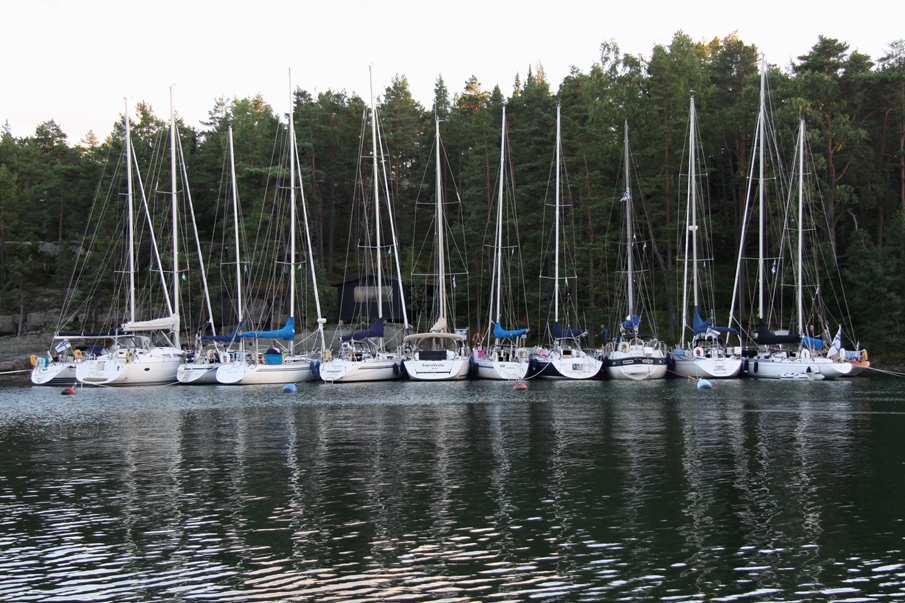 Kisafokka otettiin pian alas kurssin kääntyessä tiukkaan sivuvastaiseen ja sen jälkeen luoviin. Kahdestaan purjehtiessa meillä ei riittäisi kädetkään kisafokan käyttöön. Toinen hoitaa vesipainotankit, isopurjeen ja kääntää kurssin, toinen avaa varovasti barduunan ja loikkii vinssaamaan toisen puolen barduunan. Cruising-käytössä oleva 3Di-fokkamme on itseskuuttaava, mutta isompi kisafokka pitää skuutata käsin. Jotkut perheet ovat vastaavassa tilanteessa - käsiparien loppuessa mieshistöstä - ratkaisseet asian niin, että ovat tehneet itse lisää miehistöä, jonka on pakko purjehtia aina kun muukin perhe purjehtii.